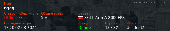 Играет на Counter Strike 1.6 сервере. Страна: РоссияПервый раз замечен 17:08 02.03.2024