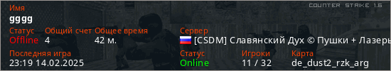 Играет на Counter Strike 1.6 сервере. Страна: РоссияПервый раз замечен 18:14 11.02.2025