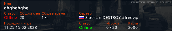 Играет на Counter Strike Source сервере. Страна: РоссияПервый раз замечен 10:19 15.02.2023