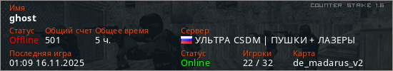 Последний раз был в сети 01:09 16.11.2025 Игрок с таким ником замечен на 50 серверах