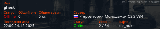 Играет на Counter Strike Source сервере. Страна: РоссияПервый раз замечен 21:49 24.12.2025