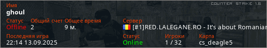 Играет на Counter Strike 1.6 сервере. Страна: РумынияПервый раз замечен 02:40 12.09.2025