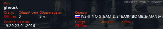 Играет на Counter Strike Source сервере. Страна: РоссияПервый раз замечен 20:09 22.01.2026
