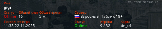 Играет на Counter Strike 1.6 сервере. Страна: РоссияПервый раз замечен 11:31 22.11.2025