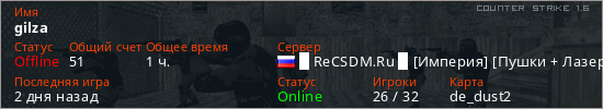 Играет на Counter Strike 1.6 сервере. Страна: РоссияПервый раз замечен 01:18 12.03.2026
