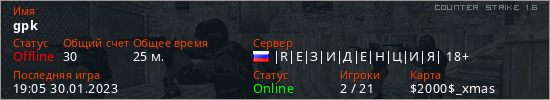 Играет на Counter Strike 1.6 сервере. Страна: РоссияПервый раз замечен 18:42 30.01.2023