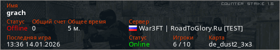 Играет на Counter Strike 1.6 сервере. Страна: РоссияПервый раз замечен 13:34 14.01.2026