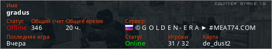 Играет на Counter Strike 1.6 сервере. Страна: РоссияПервый раз замечен 16:57 10.02.2023