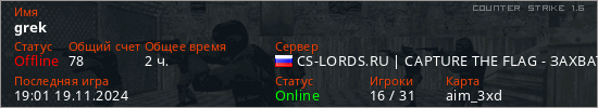 Играет на Counter Strike 1.6 сервере. Страна: РоссияПервый раз замечен 11:41 02.03.2022