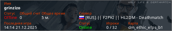 Играет на Half Life 2 DeathMatch сервере. Страна: РоссияПервый раз замечен 14:12 21.12.2025