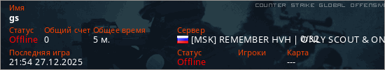 Играет на Counter Strike Global Offensive сервере. Страна: РоссияПервый раз замечен 21:52 27.12.2025
