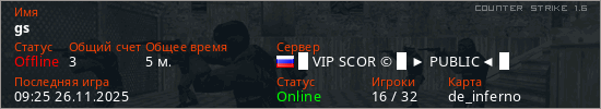 Играет на Counter Strike 1.6 сервере. Страна: РоссияПервый раз замечен 09:23 26.11.2025