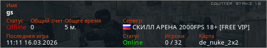 Играет на Counter Strike 1.6 сервере. Страна: РоссияПервый раз замечен 11:09 16.03.2026