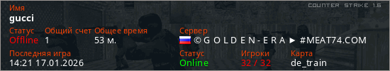 Играет на Counter Strike 1.6 сервере. Страна: РоссияПервый раз замечен 17:17 19.12.2025