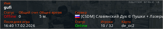 Играет на Counter Strike 1.6 сервере. Страна: РоссияПервый раз замечен 16:38 17.02.2026