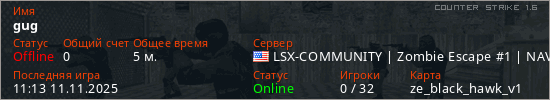Играет на Counter Strike 1.6 сервере. Страна: СШАПервый раз замечен 11:06 11.11.2025
