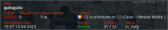 Играет на Counter Strike 1.6 сервере. Страна: РумынияПервый раз замечен 15:33 13.04.2025