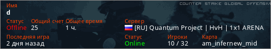 Играет на Counter Strike Global Offensive сервере. Страна: РоссияПервый раз замечен 21:23 11.04.2026