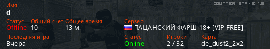 Последний раз был в сети Вчера Игрок с таким ником замечен на 56 серверах