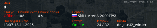 Играет на Counter Strike 1.6 сервере. Страна: РоссияПервый раз замечен 15:36 16.11.2022