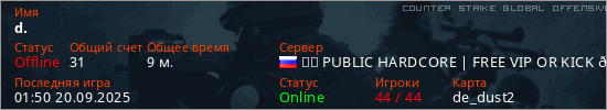 Играет на Counter Strike Global Offensive сервере. Страна: РоссияПервый раз замечен 01:19 20.09.2025