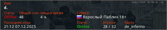 Играет на Counter Strike 1.6 сервере. Страна: РоссияПервый раз замечен 16:29 09.07.2020