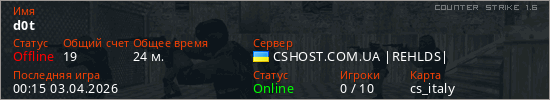 Играет на Counter Strike 1.6 сервере. Страна: УкраинаПервый раз замечен 00:56 22.03.2026