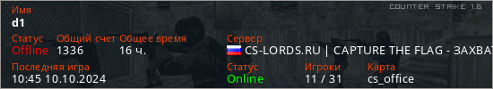 Играет на Counter Strike 1.6 сервере. Страна: РоссияПервый раз замечен 16:53 05.07.2021
