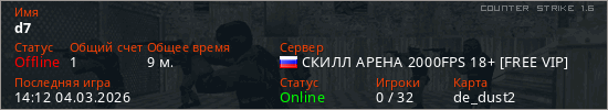 Играет на Counter Strike 1.6 сервере. Страна: РоссияПервый раз замечен 10:04 28.02.2026