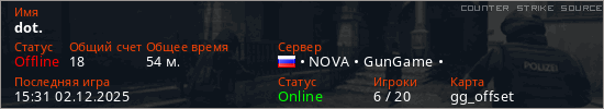 Играет на Counter Strike Source сервере. Страна: РоссияПервый раз замечен 16:39 11.08.2025