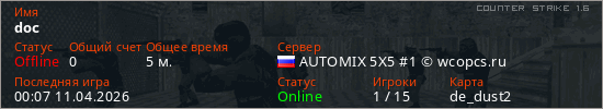 Играет на Counter Strike 1.6 сервере. Страна: РоссияПервый раз замечен 00:05 11.04.2026