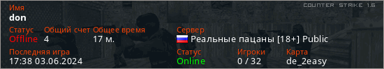 Играет на Counter Strike 1.6 сервере. Страна: РоссияПервый раз замечен 23:35 09.06.2023