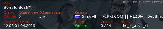 Играет на Half Life 2 DeathMatch сервере. Страна: РоссияПервый раз замечен 12:04 01.04.2026