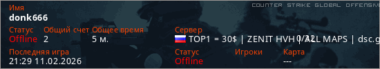 Играет на Counter Strike Global Offensive сервере. Страна: РоссияПервый раз замечен 21:25 11.02.2026
