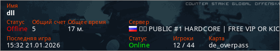 Играет на Counter Strike Global Offensive сервере. Страна: РоссияПервый раз замечен 20:38 20.01.2026