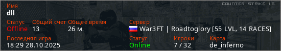 Играет на Counter Strike 1.6 сервере. Страна: РоссияПервый раз замечен 17:41 19.10.2025