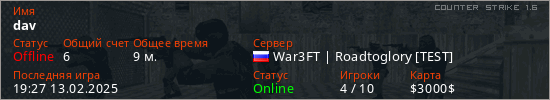 Играет на Counter Strike 1.6 сервере. Страна: РоссияПервый раз замечен 19:18 13.02.2025