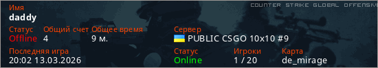 Играет на Counter Strike Global Offensive сервере. Страна: УкраинаПервый раз замечен 22:17 11.03.2026