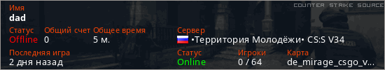 Играет на Counter Strike Source сервере. Страна: РоссияПервый раз замечен 22:38 23.01.2026