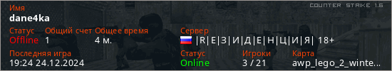 Играет на Counter Strike 1.6 сервере. Страна: РоссияПервый раз замечен 19:22 24.12.2024