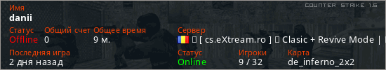 Играет на Counter Strike 1.6 сервере. Страна: РумынияПервый раз замечен 21:39 11.03.2026