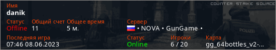 Играет на Counter Strike Source сервере. Страна: РоссияПервый раз замечен 07:29 08.06.2023