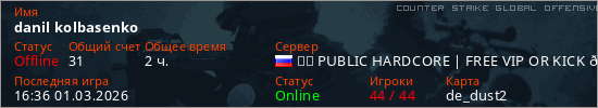 Играет на Counter Strike Global Offensive сервере. Страна: РоссияПервый раз замечен 12:04 22.12.2025