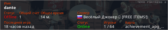 Играет на Team Fortress 2 сервере. Страна: РоссияПервый раз замечен 12:46 09.03.2026