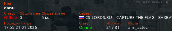 Играет на Counter Strike 1.6 сервере. Страна: РоссияПервый раз замечен 17:53 21.01.2026