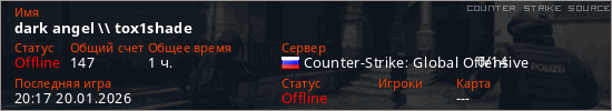 Играет на Counter Strike Source сервере. Страна: РоссияПервый раз замечен 15:39 09.10.2025