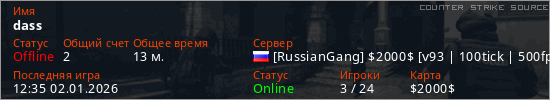 Играет на Counter Strike Source сервере. Страна: РоссияПервый раз замечен 09:56 02.01.2026