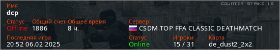 Играет на Counter Strike 1.6 сервере. Страна: РоссияПервый раз замечен 13:04 27.05.2020
