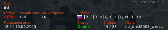 Играет на Counter Strike 1.6 сервере. Страна: РоссияПервый раз замечен 18:27 03.02.2020