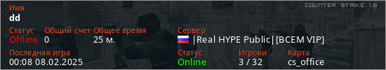 Играет на Counter Strike 1.6 сервере. Страна: РоссияПервый раз замечен 19:23 29.12.2023
